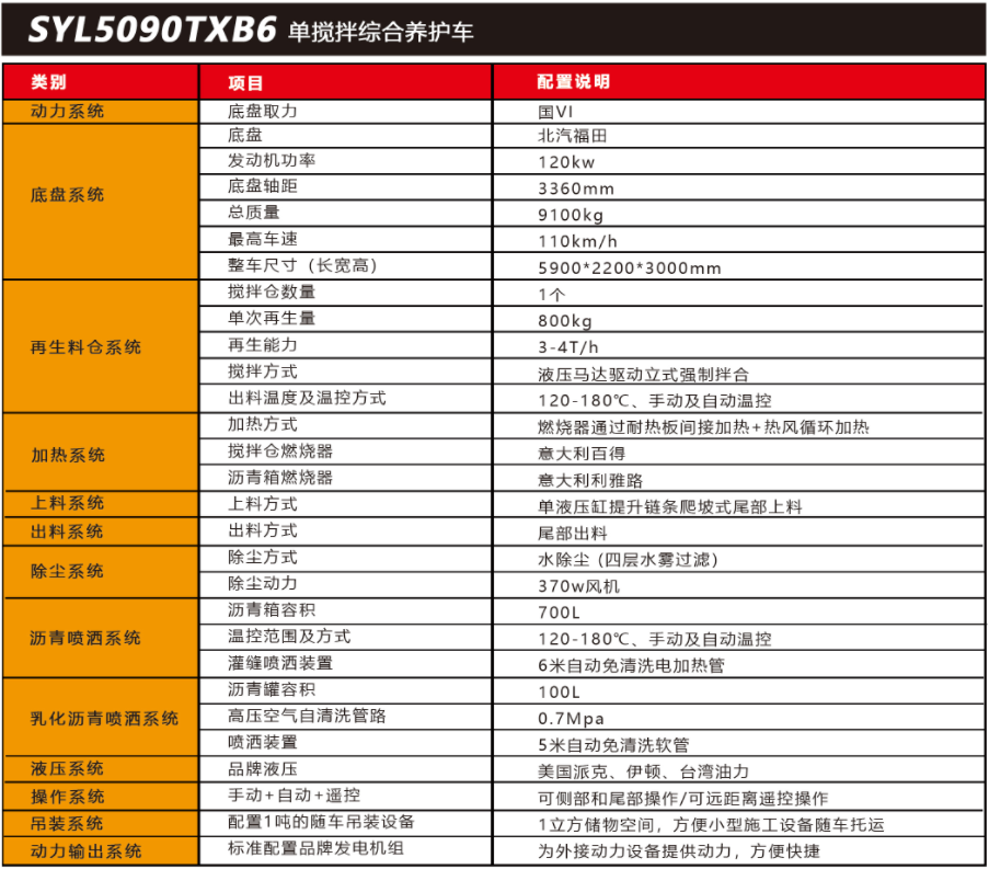 SYL5090TXB6 單攪拌綜合養(yǎng)護車是一款集現(xiàn)場生產(chǎn)新瀝青混合料、瀝青路面冷料、 舊料、銑刨料 100%現(xiàn)場加熱再生利用 ,熱瀝青灑布、裂紋跟蹤灌縫、乳化瀝青噴灑、為其他裝置提供電力和液壓動力等多種功能于一體的瀝青路面熱再生綜合養(yǎng)護車。可實現(xiàn)多 場合、多路面的各種類養(yǎng)護作業(yè) ,養(yǎng)護修補費用低 ,作業(yè)快捷 ,高效率、節(jié)能環(huán)保性能突 出等特點。適用于市政、? 國省道路、鄉(xiāng)村公路、廠區(qū)、園區(qū)等狹窄區(qū)域瀝青路面小型養(yǎng)護修補施工。