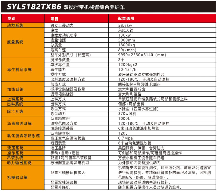 SYL5182TXB6 雙攪拌帶機(jī)械臂路面綜合養(yǎng)護(hù)車是一款集現(xiàn)場(chǎng)生產(chǎn)新瀝青混合料、瀝青路面冷料、舊料、銑刨料 100%現(xiàn)場(chǎng)加熱再生利用 ,熱瀝青灑布、裂紋跟蹤灌縫、乳化 瀝青噴灑、為其他裝置提供電力和液壓動(dòng)力等多種功能于一體的瀝青路面熱再生綜合養(yǎng)護(hù)車。配置智能隧道檢測(cè)設(shè)備 ,一車多能 ,完成對(duì)公路、隧道病害? (坑槽、裂紋等)? 進(jìn)行智能檢測(cè)和快速修補(bǔ)??蓪?shí)現(xiàn)多場(chǎng)合、多路面的各種類養(yǎng)護(hù)作業(yè)。養(yǎng)護(hù)修補(bǔ)費(fèi)用低 ,作業(yè)快捷 ,高效率、節(jié)能環(huán)保性能突出等特點(diǎn)。適用于多種路況的中大施工量和高速公路中的隧道的檢測(cè)和修補(bǔ)施工。
