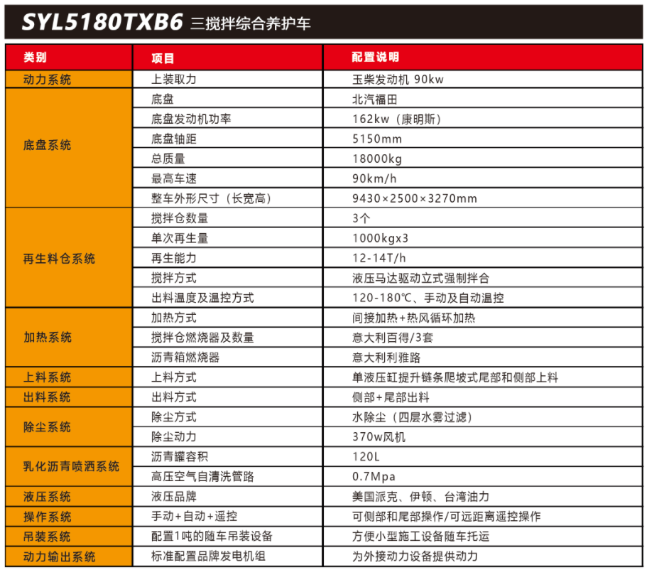 SYL5180TXB6 三攪拌路面綜合養(yǎng)護車是一款集現(xiàn)場生產(chǎn)新瀝青混合料、瀝青路面冷 料、舊料、銑刨料 100%現(xiàn)場加熱再生利用,熱瀝青灑布、裂紋跟蹤灌縫、乳化瀝青噴灑、 為其他裝置提供電力和液壓動力等多種功能于一體的瀝青路面熱再生綜合養(yǎng)護車??蓪崿F(xiàn)多場合、多路面的各種類養(yǎng)護作業(yè)。養(yǎng)護修補費用低 ,作業(yè)快捷 ,高效率、節(jié)能環(huán)保性能