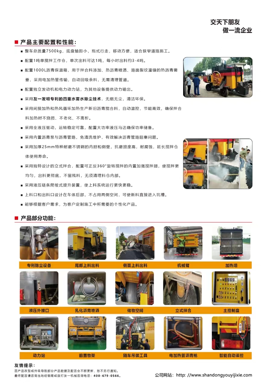 山東友一機(jī)械設(shè)備有限公司主要生產(chǎn)路面綜合養(yǎng)護(hù)車(chē)、瀝青路面養(yǎng)護(hù)車(chē)、道路養(yǎng)護(hù)車(chē)、瀝青熱再生修補(bǔ)車(chē)、瀝青灌縫機(jī),專(zhuān)注、專(zhuān)業(yè)于道路養(yǎng)護(hù)機(jī)械設(shè)備與養(yǎng)護(hù)材料的生產(chǎn)和研發(fā)。